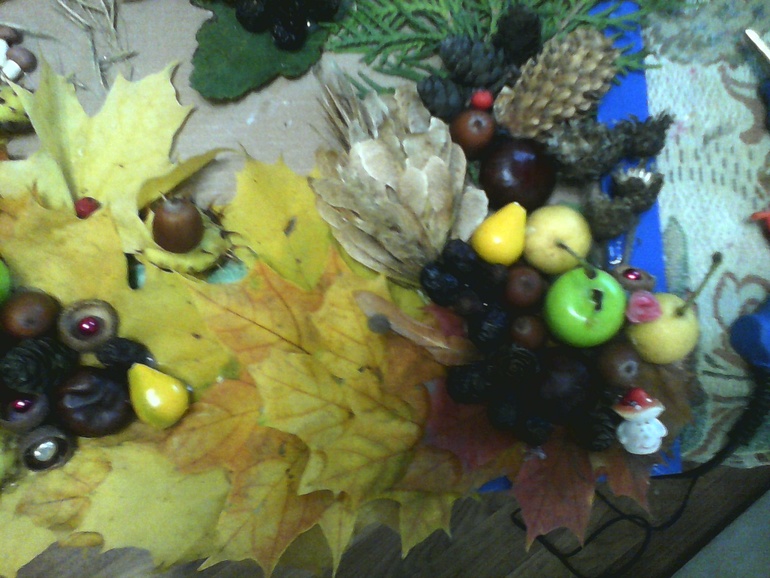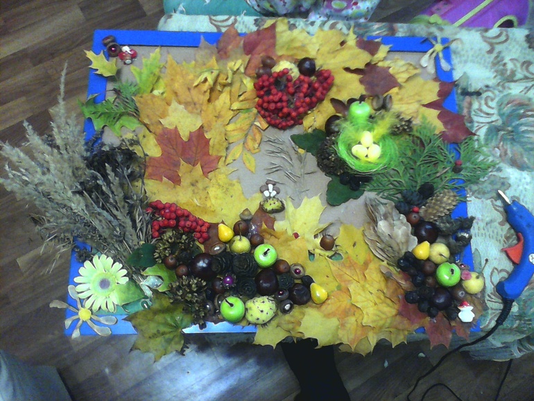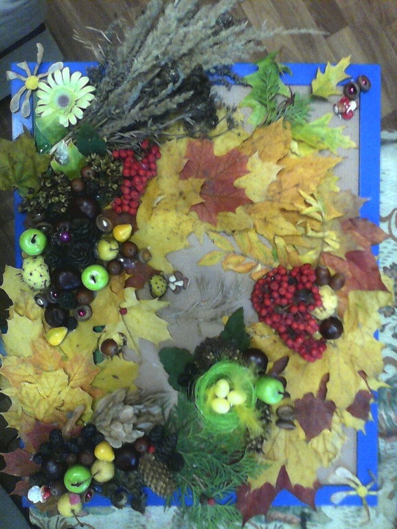 это старшей Эвелины (семья ежей в лесу из шишек и букет роз из кленовых листьев рядом):