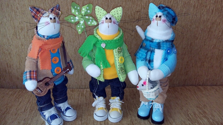 Суперские коты!!!!!!!!!!! Как раз собираюсь сшить семью ушастиков) Если не трудно, киньте ссылки на мк, о которым учились? И обувь как делаете?