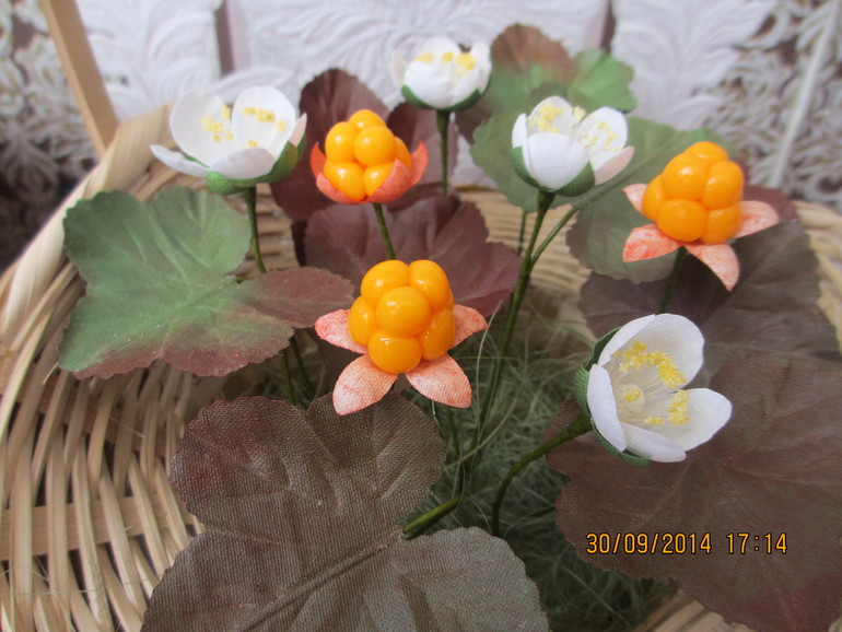 Ягодки - полимерная глина.Цветы - бязь. Тычинки - манка.