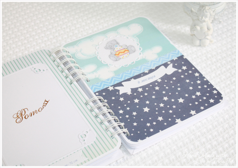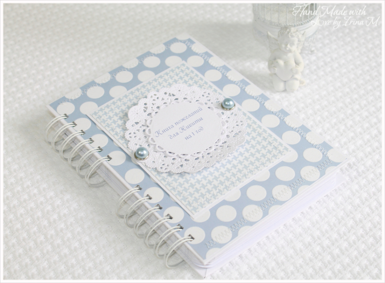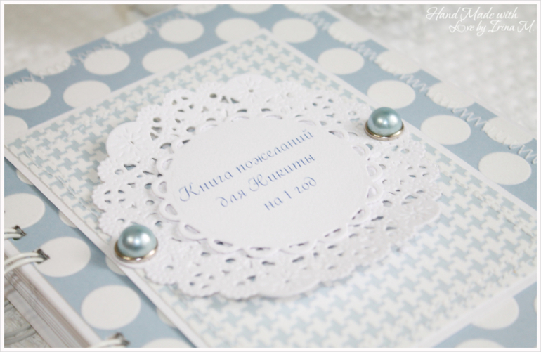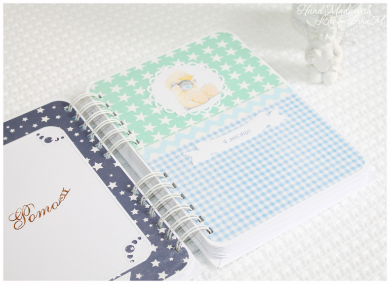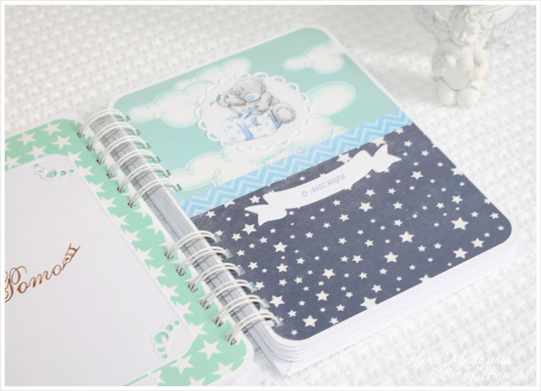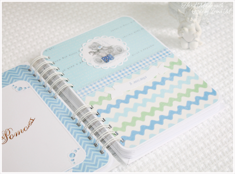 СкрапбукингФормат альбома А5, вмещает 12 фотографий от 0 до года, а так же в конце альбома есть место для пожеланий на первый день рождения. Выполнен в нежной голубой гамме в стиле мишек Тэдди. Так же под каждым фото указан рост и вес малыша.