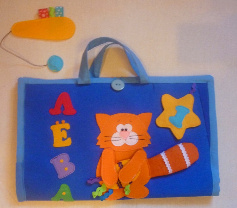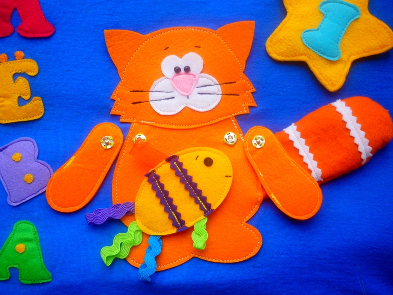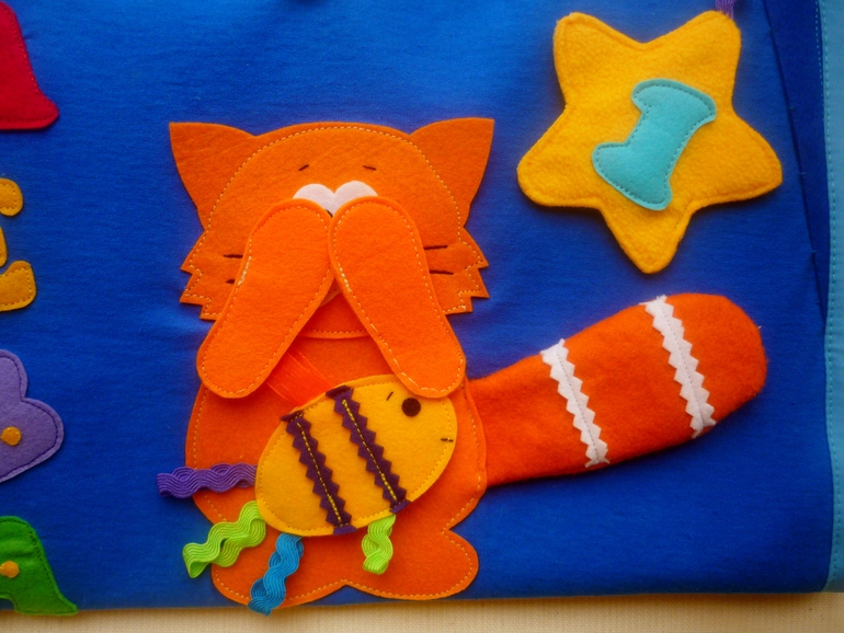 На обложке: рыжий кот- хвост шуршит, лапка на кнопках, рыбка на липучке, ею можно котика кормить. Звезда с цифрой 1 на липучке. Играем с котиком в ку-ку.