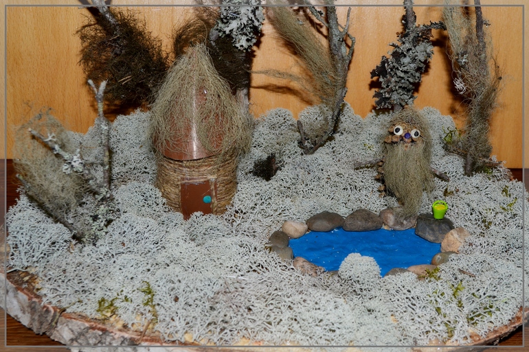 А летом мы заранее насобирали в лесу шишек, веточек красивых, мох, поэтому нам с дочкой не составило труда соорудить вот такую поделочку, надеемся в садике оценят наши труды.