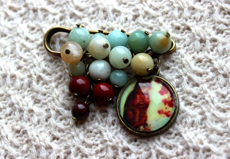"Лунный кот". Брошь выполнена из амазонита, яшмы и фурнитуры под бронзу.