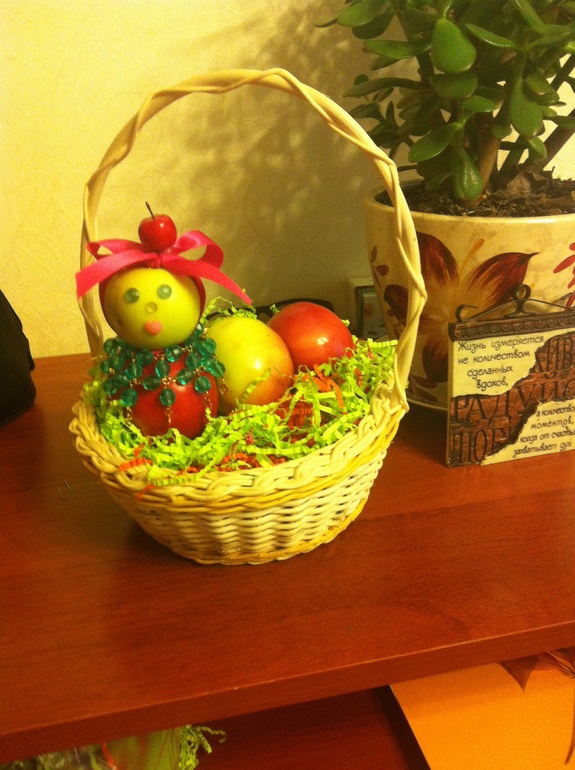 Корзиночка была и наполнитесь для корзины был, в подарочные коробки такое кладут для объема:) взяли яблочки поровнее и приблизительно одного размера на туловище и голову чуть поменьше и все сцепили зубочистками, нарядили ее и отправили в сад:)