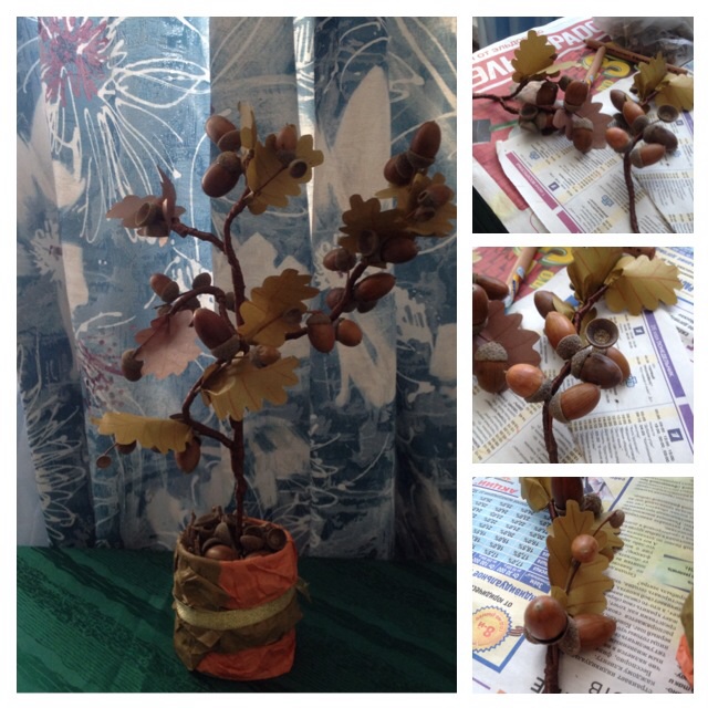 Желуди можно супер клеем,быстрее,но мы клеили Титан клеем,ствол и ветки проволочные,для надежности, а залили алебастром.Тоже решили смастерить? У вас вон сколько красоты,материалов,деревце будет потрясающим)