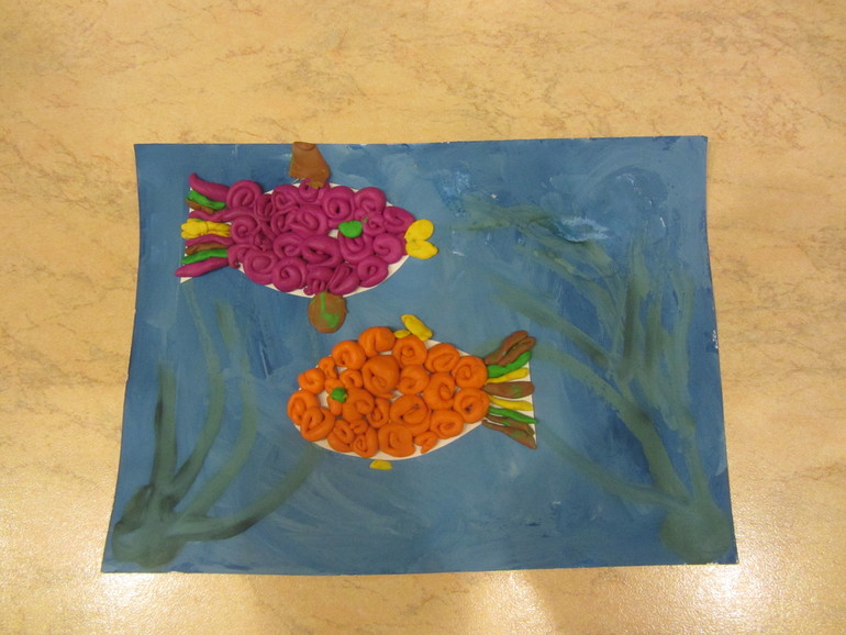 Поделки с детками.Сегодня дочка принесла с "рисования" рыбок, я много видела как можно и размазывать пластилин, и кусочками отщипывать и выкладывать как чешуей, делать длинные палочки и кругляшками украшать, но первый раз увидела как можно делать маленькие улитки и выкладывать ими рыбок. Как идею можно использовать :)