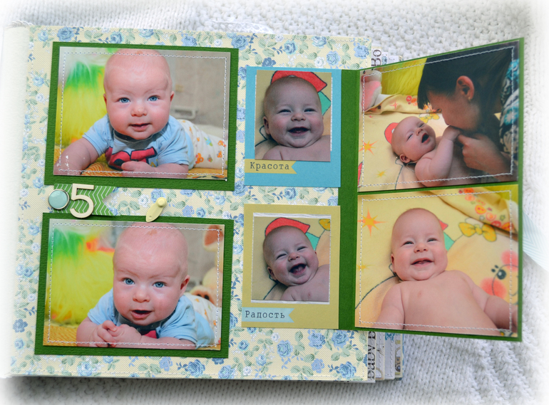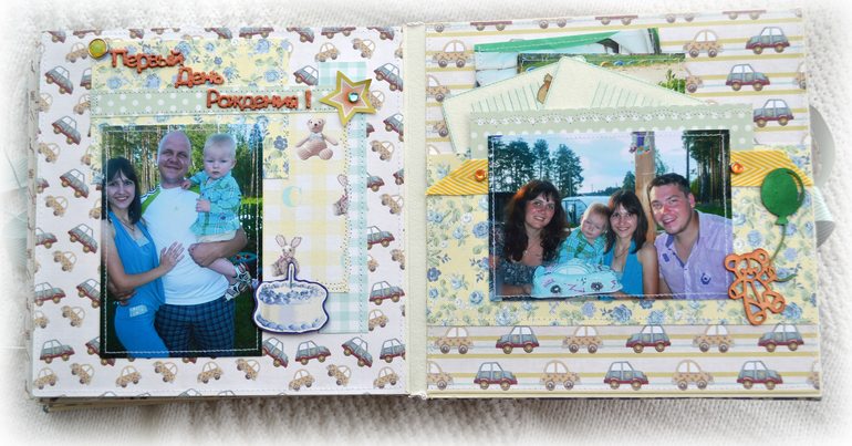 И последний, восьмой разворот про день рождения мальчика. На нем всего 2 фотографии - с родителями и с крестными, а справа кармашек для еще нескольких невместившихся фоток и карточек про зубки и достижения Темки.