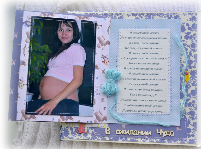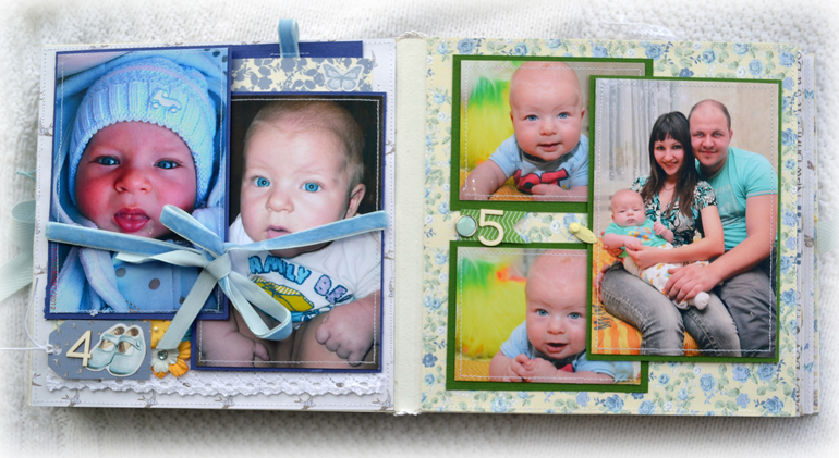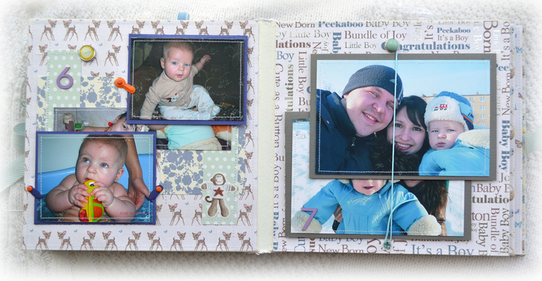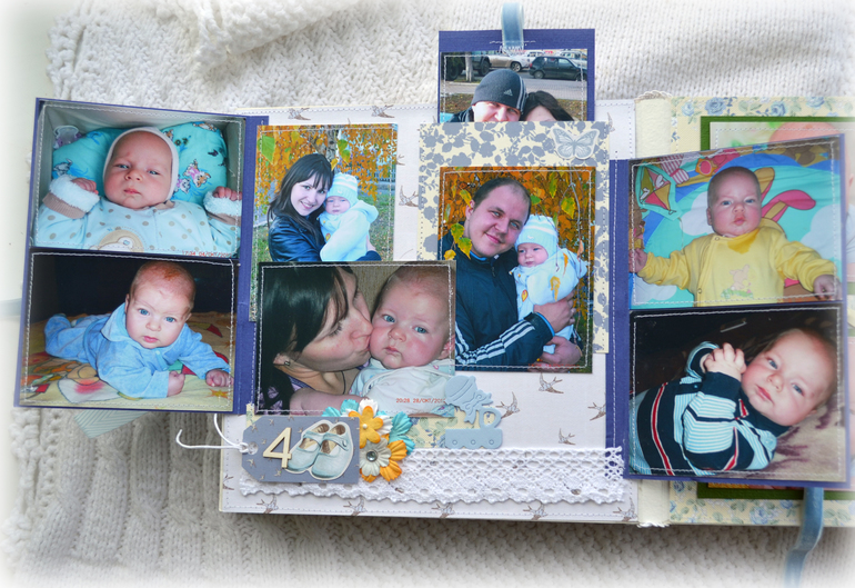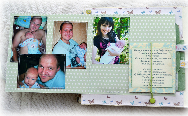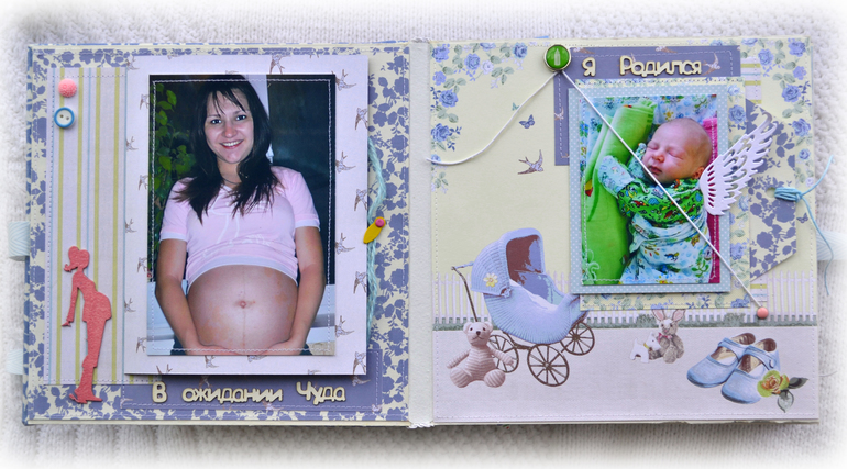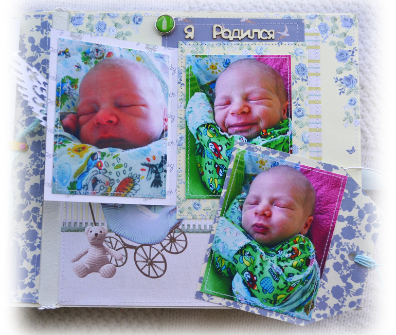 Итак, первый разворот - беременность и фото из роддома. На левой страничке 4 фото. На правой страничке тэг с метрикой и 3 фотки.