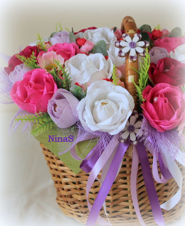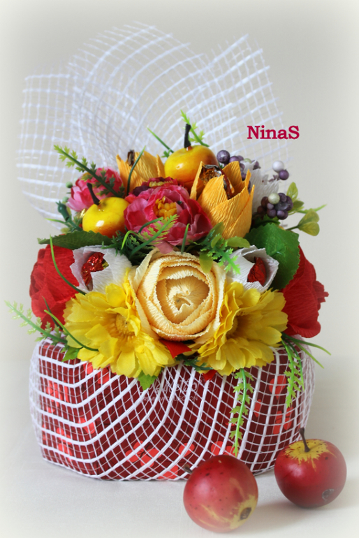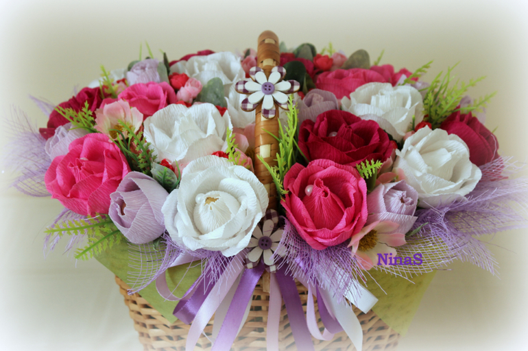Нина, работы у Вас просто восхитительные!!! А корзинка — вообще прелестная, глаз не оторвать! Подскажите, пожалуйста, где Вы покупаете гофру, сетку и декор? Я тоже из Краснодара, покупаю на Шевченко (оптовая база). Но там выбор гофры не большой, красный цвет какой-то странный (я бы назвала его бордовым), а Ваши розы такого красивого, насыщенного цвета!