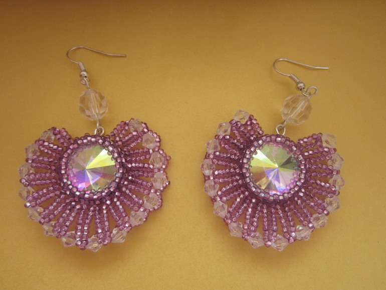 Бисер. Бисероплетение. Украшения из бисера.Увидела подобный комплект в интернете, он назывался "Марьяна" и ахнула. И никогда не думала что смогу повторить. Да и необходимых материалов у меня не было. А как то в магазине(где я обычно покупаю бусины) увидела стразы(у них одна сторона как у риволи, а другая - плоская) переливающиеся всеми цветами радуги и сразу же вспомнила этот комплект. Плела по одноименному МК с некоторыми изменениями(бисер брала чешский и весь одного цвета, а "риволи" оплетала цепочкой в крестик). Сережки у меня получились далекими от идеала да еще и сильно выпуклыми, но мне все-равно нравятся