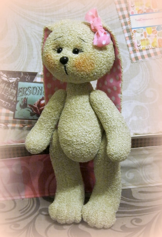 Спасибо! Ткань называется Астра, декоративная, видимо мебельная, но очень мягкая и шелковистая, без клеевого слоя. Мне она так понравилась, что закупила разных цветов, теперь пробую шить всякое))). Очень хорошо из нее получаются овечки . А глазки — это бусины черные. Из пришиваю и утягиваю мордочку одновременно. А вот носик специальный, для игрушек, вставляется пока не набита голова.