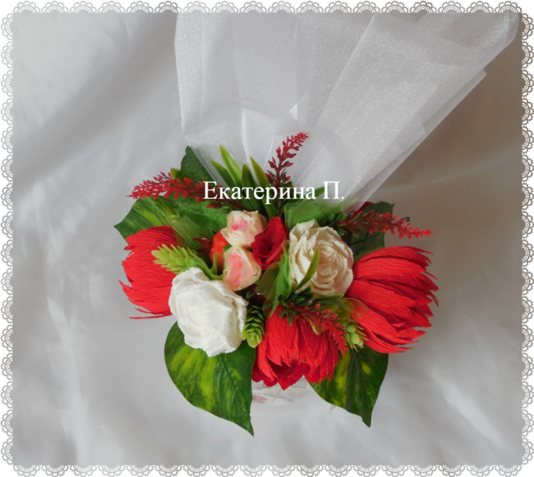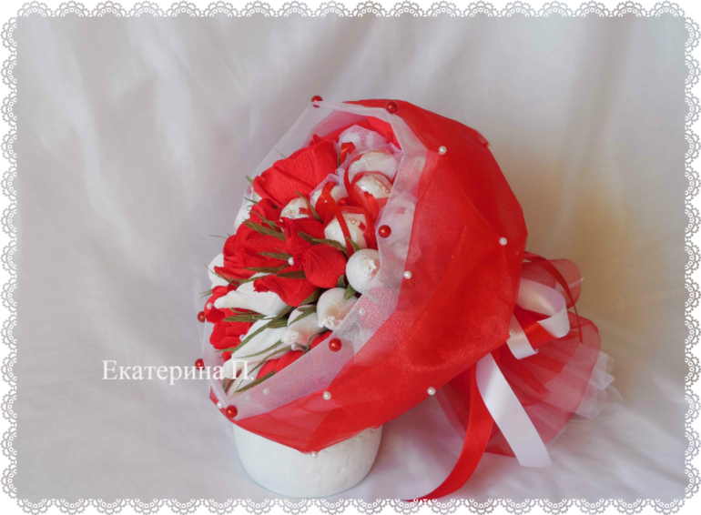 И еще букет преподавателю. Делала уже такой, здесь скомбинировала белую и красную органзу в упаковке.