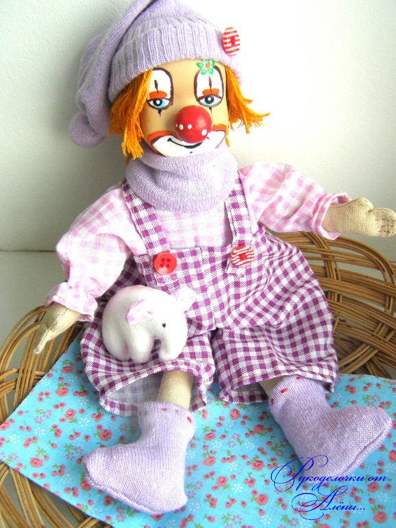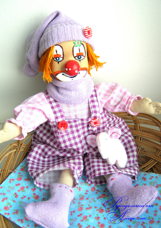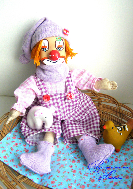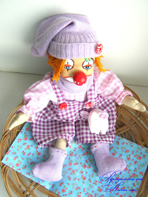 Заготовочка головы клоуна уже давно ждала своего часа и наконец я её расписала акриловыми красками... А уж после того, как он взглянул на меня своими голубыми глазками... не смогла его отложить ни на минуту, стала шить:) Рисунок одежды определил имя для Клеточки, а моё настроение - лавандово-сиреневый цвет.....