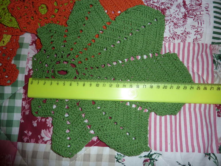у моей подруги день рождения в сентябре. исполнилось ей 33 и поэтому связала ей салфетки (3 оранжевых и 3 зеленых). Надеюсь украсят ее новую кухню:)