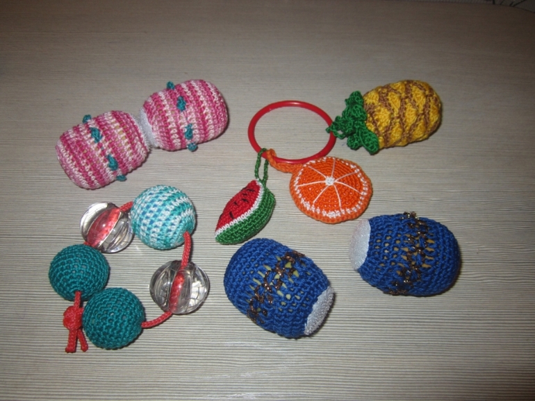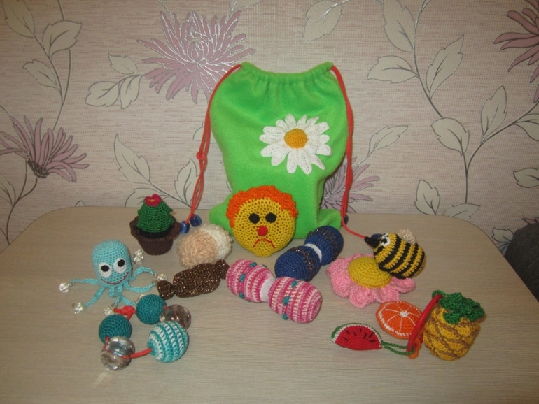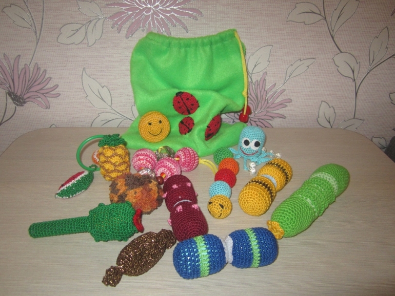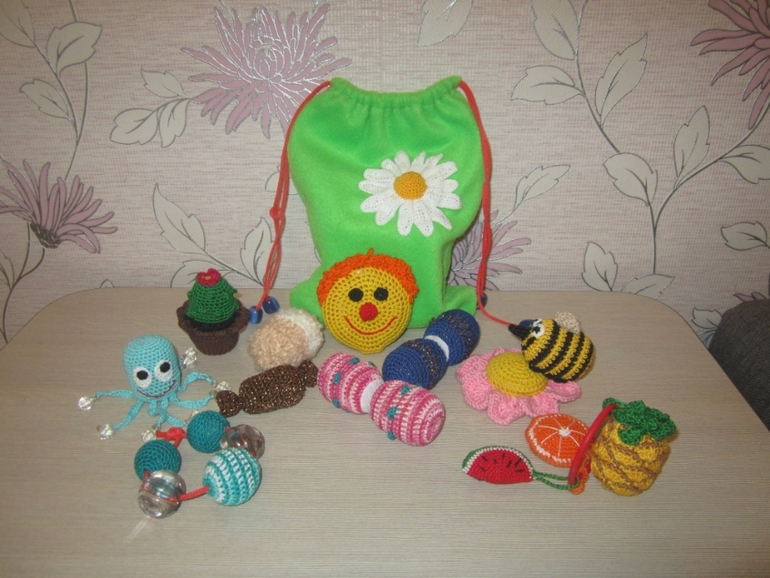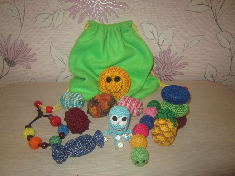Все гремит по-разному, пряжа тоже разная, шишечки, липучки, кнопочки, внутри контейнеров - крупы, фасоль. Все для развития мелкой моторики, интересных игр, получения сенсорных ощущений