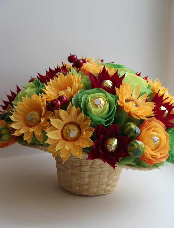 Галина, у Вас есть МК подсолнухов? меня попросили букетик в осенней тематике, а от этой корзиночки я до сих пор в восторге)))