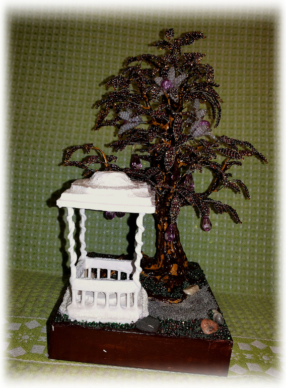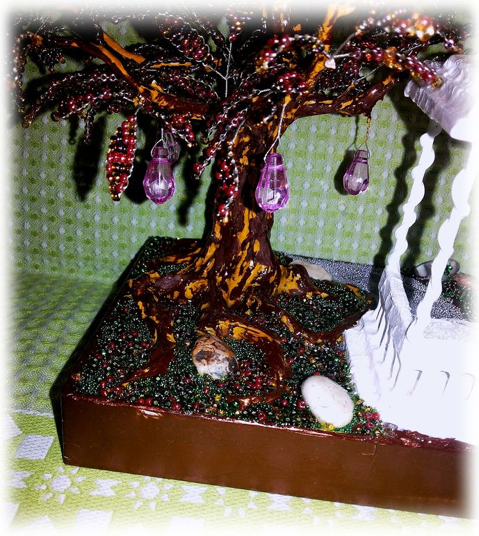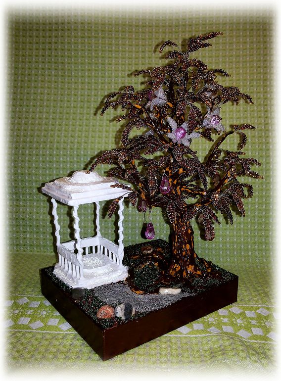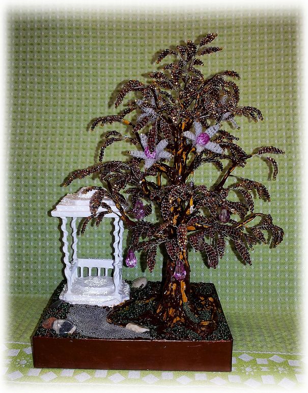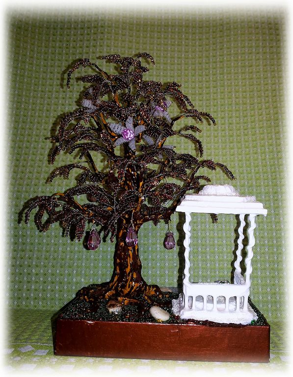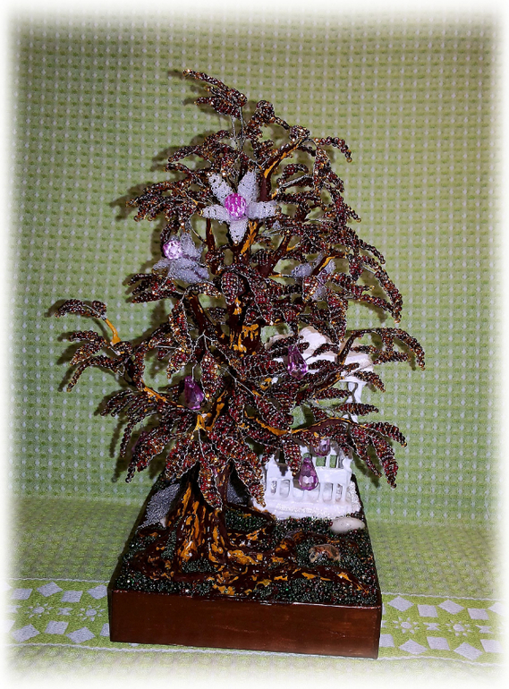 Пленило меня сочетание фиолетово-золотых оттенков бисера, кроме того, младшенькой были растерзаны бабушкины искусственные цветы, оставшиеся же от них серединки - бусинки-капельки, удачно сочетающиеся с уже собранным мной фиолетовым миксом, натолкнули меня на идею создания вот такого цветуще-плодоносящего дерева.