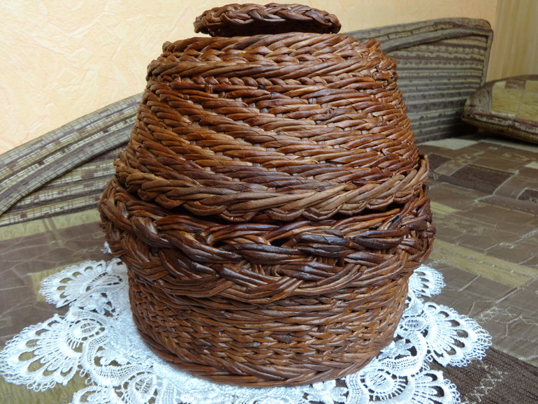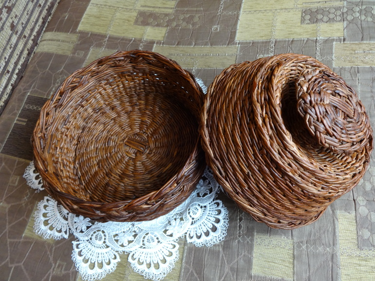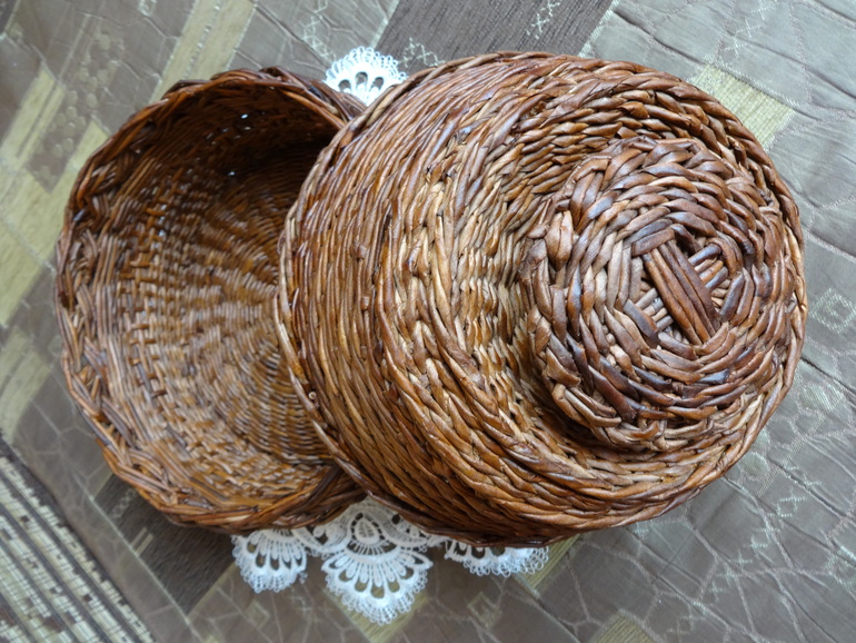 Сплетена из бумажной лозы, лоза покрыта морилкой мокко. Корзина прочная, вместительная, но очень легкая.