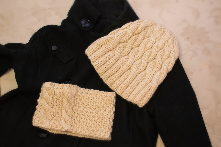 Шапка косами, свободная, мягкая и теплая. К ней такой мини-снуд. Шерсть.