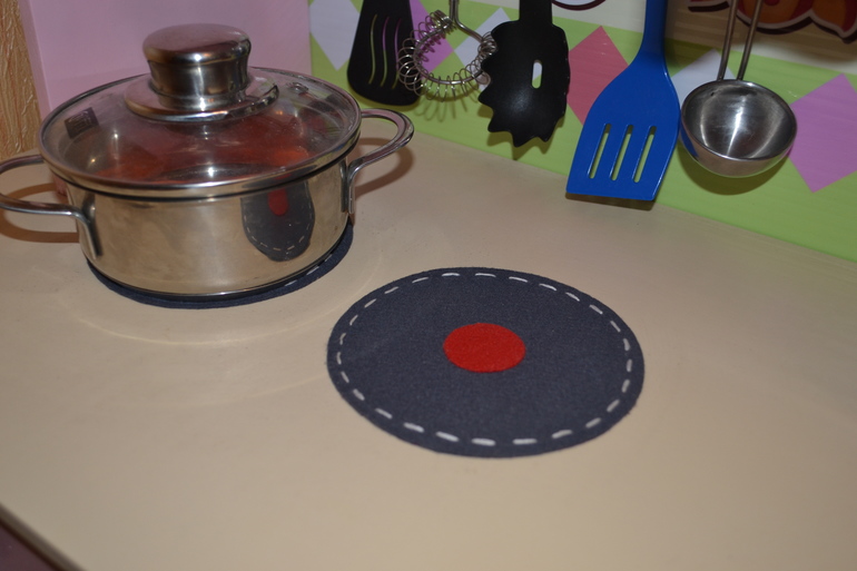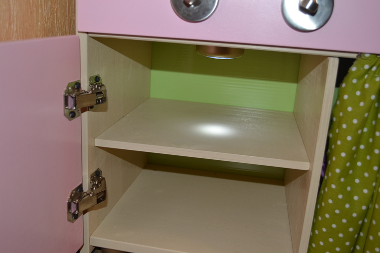 Рейлинг для поварешек я купила в Леруа за 70 рублей и крючки за копейки, комфорки сделала из фетра и приклеила их на клей для страз немецкий (супер клей, клеит все и намертво!!!!). Переключатели комфорок - это типо дверной замок-защелка (самый дешевый). Духовку предполагалось делать с орг-стеклом, но мы с мужем обленились и решили позже просто фальш-картинку из самоклейки приклеить. Внутри духовки ( с верху) приклеили лампочку-светодиодную (включается нажатием) и теперь у нас в духовке свет есть!