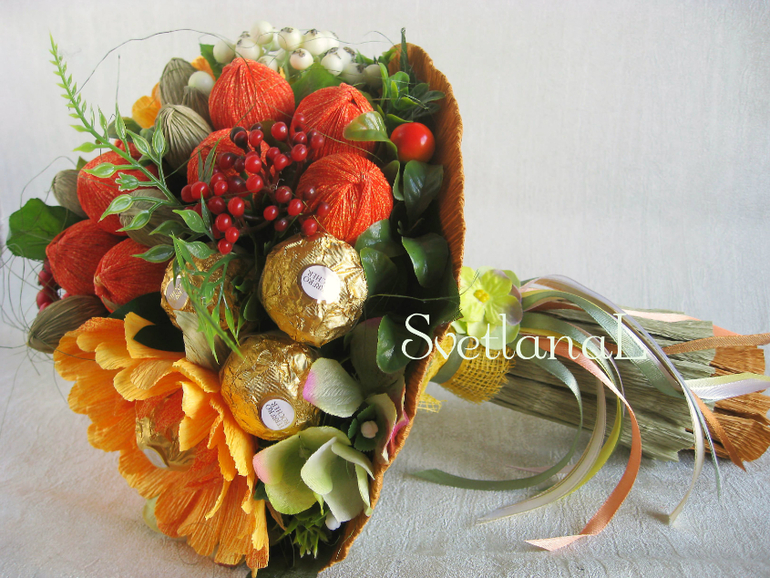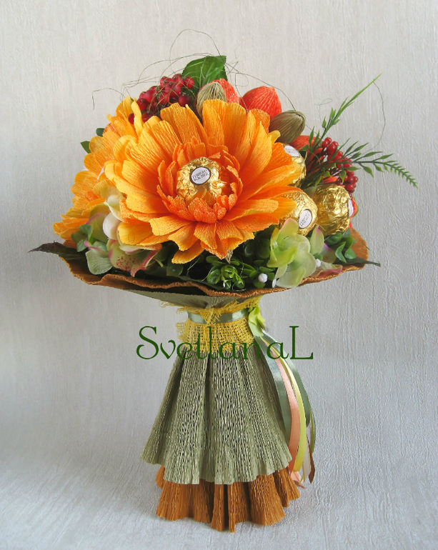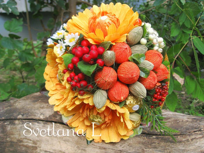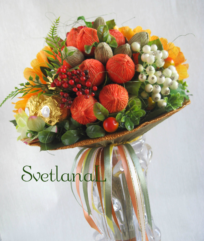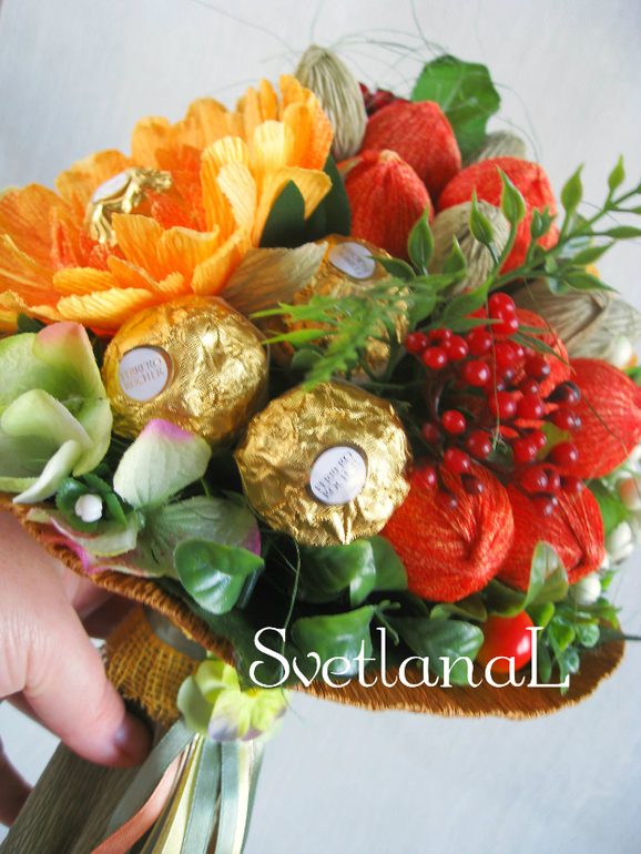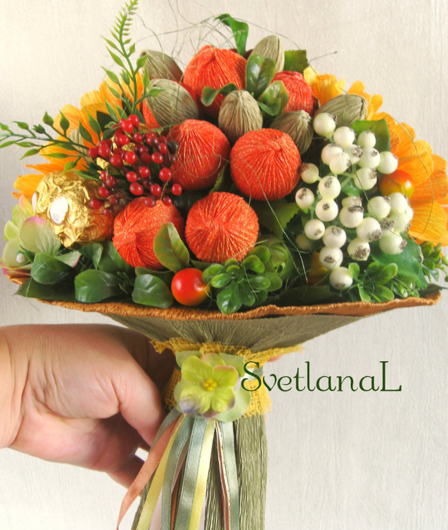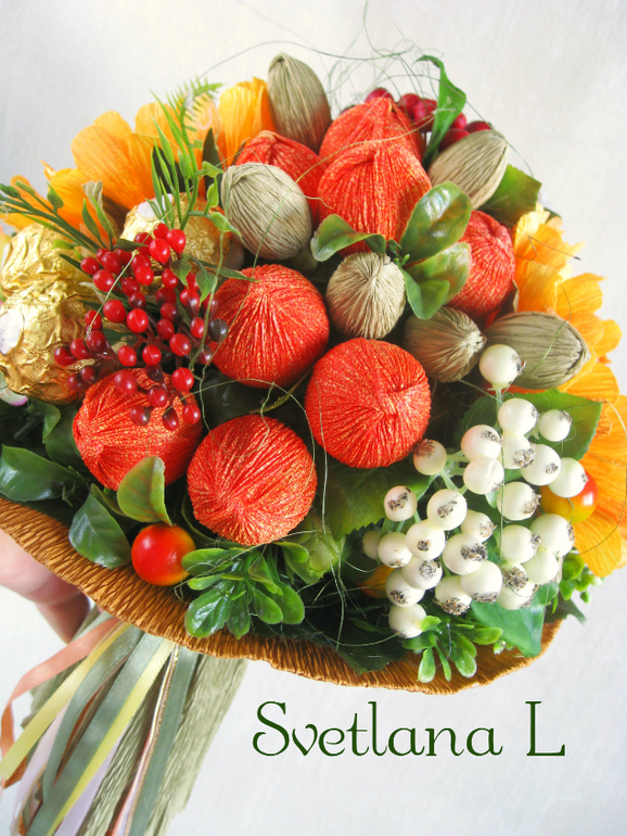 Супер,я бы не сказала,что материалов "из того,что было",с такими словами тут такое выкладывают,что стыдно было бы даже родным показать,а этот букет очень красивый,яркий,вкусный!