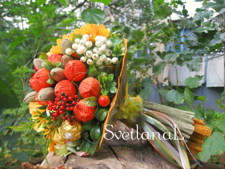 Вот один букетик к дню учителя...сделала из имеющихся материалов, я его слепила из того, что было...хотя всегда хочется купить что-то новенькое...из имеющегося было трудно "упаковать" красиво, вот что вышло...