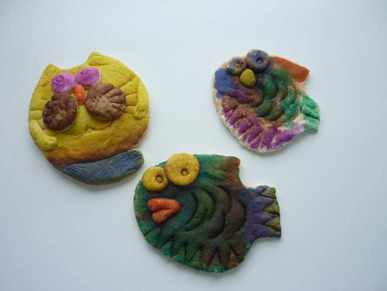 Поделки с детками.Это мы с Темским еще не пробовали. Встречайте-наши первые соленушки. Артем был в восторге отпроцессы. Налепил еще криворуких кособоких снеговиков. Я красила нижнюю рыбку (самой жутко интересно было) и помогала красить котика