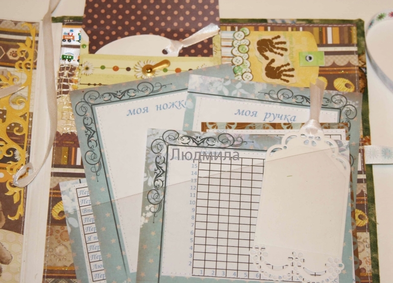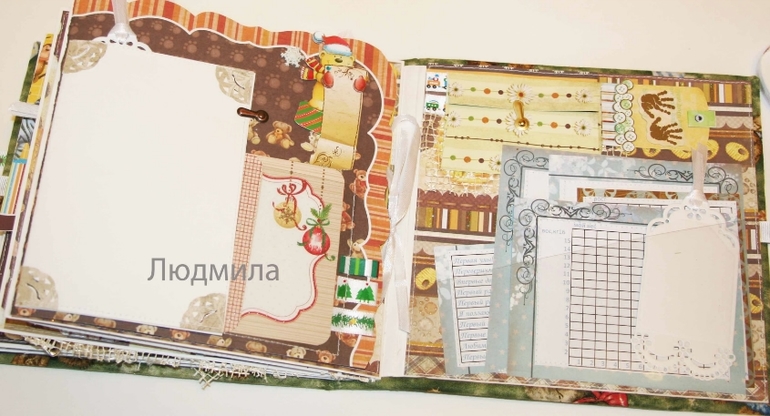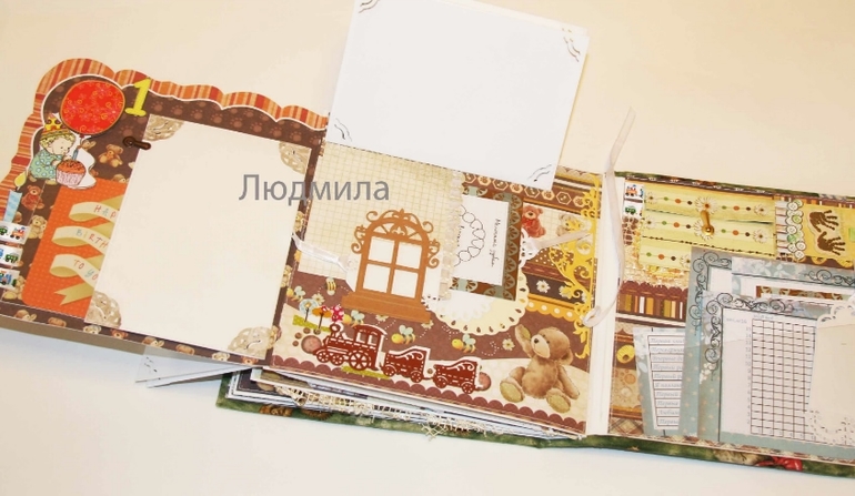 Альбом на первый годик жизни малыша вмещает более 100 фото 10х15 и несколько нестандартных,много секретиков,раскладушек, два кармашка для невместившихся фоток, дисков...место для фото с узи, много места для журналинга, есть теги -;мой рост, вес,первые умелки; моя ручка, моя ножка,конвертик для первых волосиков. и т.д..Разделы: купание, сон, первый День Рождения, первый Новый год,любимые игрушки, место для бирки, на обложку можно вставить фото.Все странички и подложки под фото прошиты на машинке.