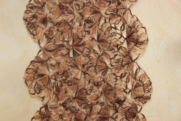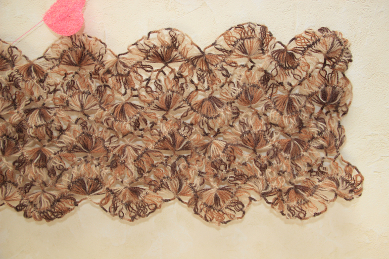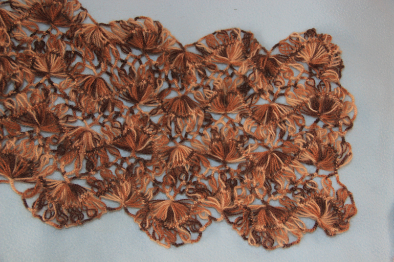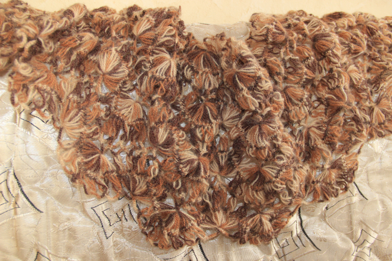 отлично у Вас получилось! я такой тоже вязала, тоже первый был)) цепочка из 8 п. насколько помню стянутости не было, но это скорее из-за того, что я более свободно вяжу. Но была другая проблема, при соединении полос у меня рисунок постоянно съезжал. Следующий шарф вязала, вот там конкретно стянуло, с тех пор вяжу образец)