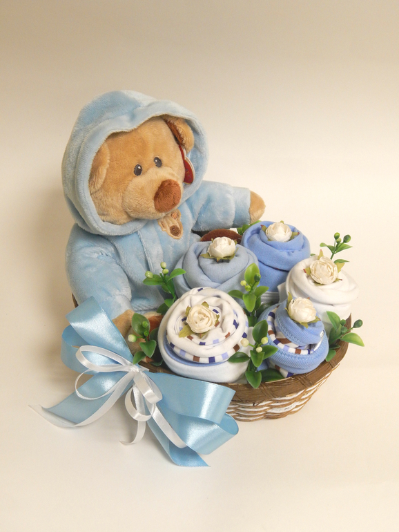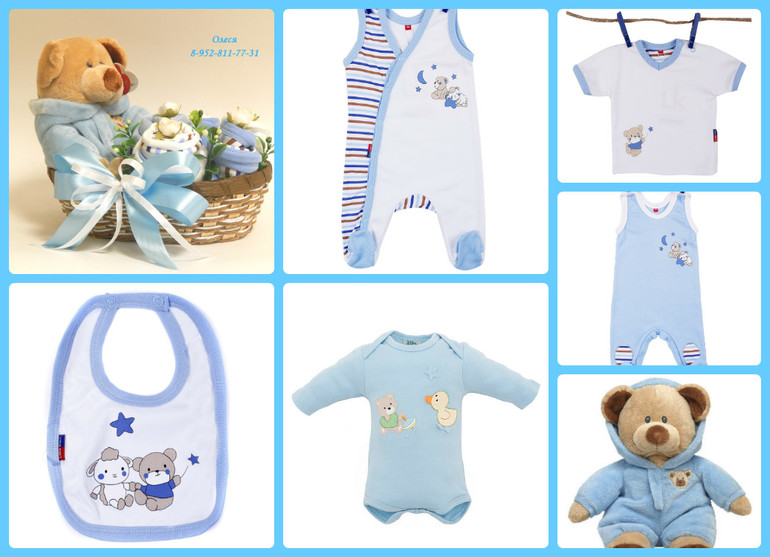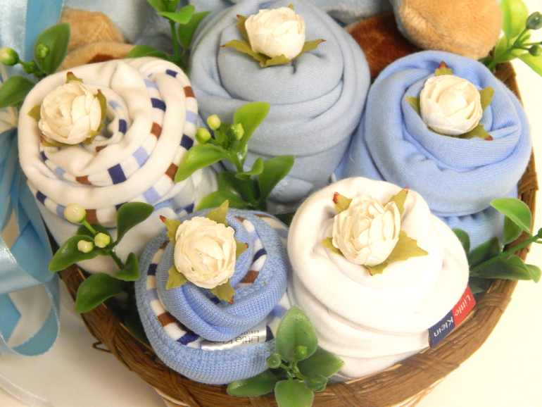 Представляю свою очередную работу из серии "Вaby-букеты". В состав подарка входит детская одежда фирмы Little Klein (Польша): полукомбинезон, футболка, слюнявчик; боди с длинным рукавом (FS Confeccoes, Португалия). Девочки, может что-то посоветуете по оформлению?