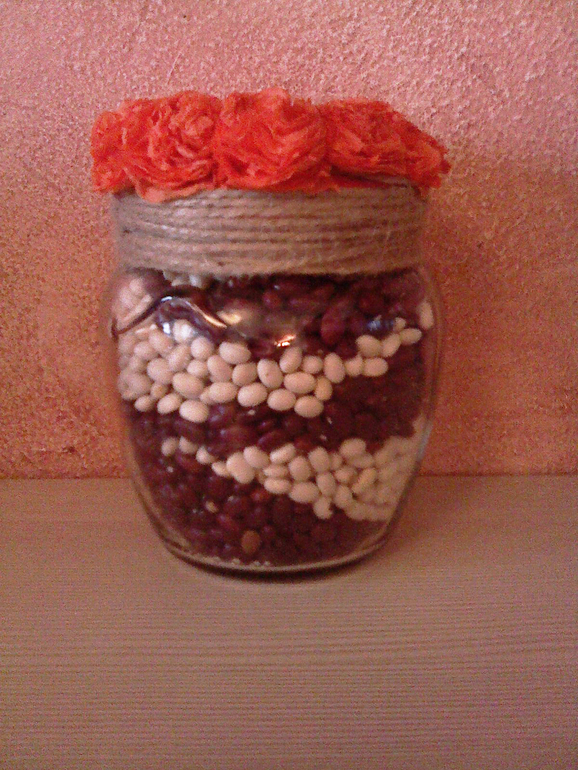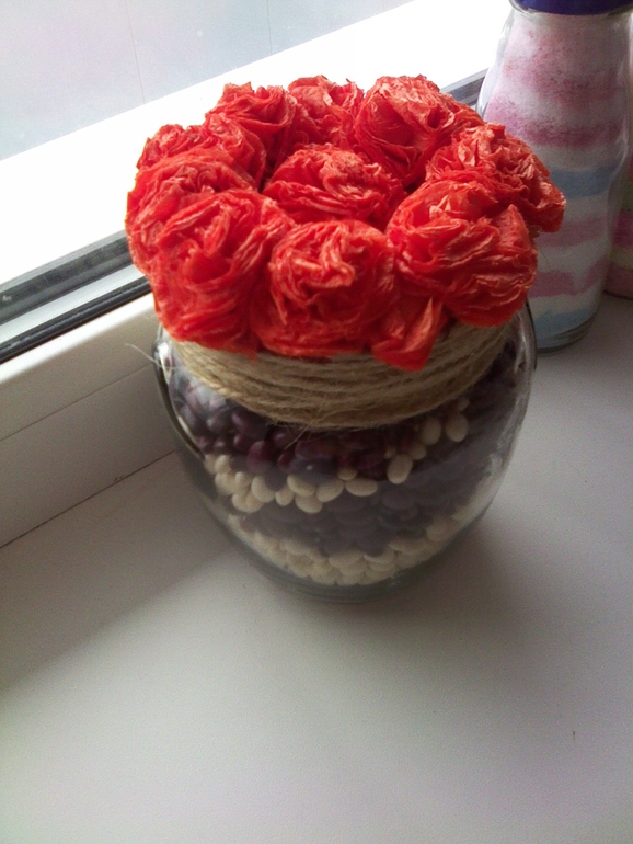 Фасолинки Карина сама насыпала. Шпагат то же сама обматывала. И цветочки из салфетки сама делала, оказывается они такие в саду делали.