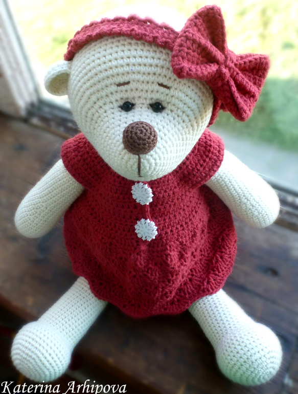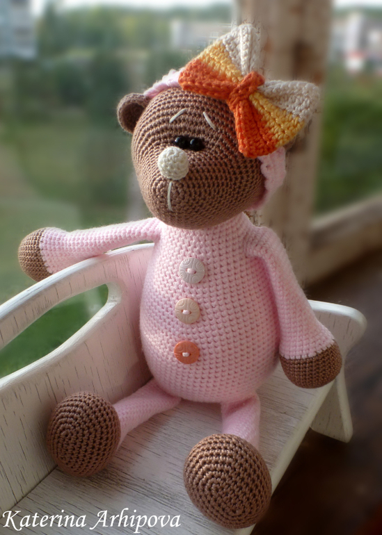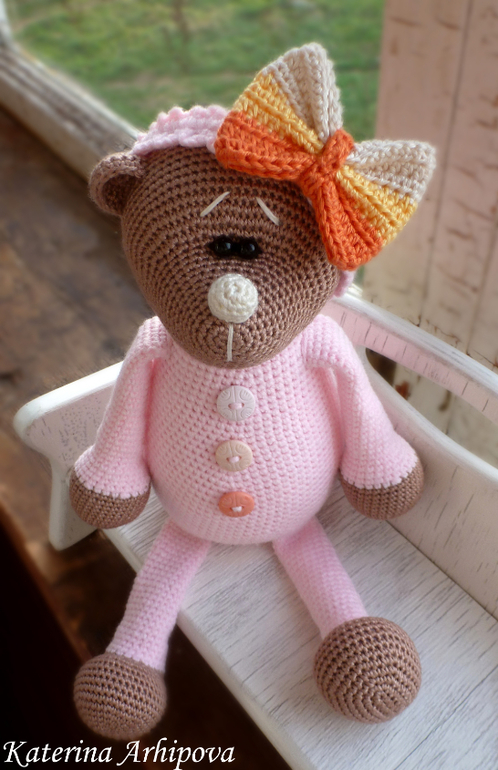 Надеюсь не ты одна))))...Только это будет мишка без капюшона!!!!! просто в пижамке и шапочке может...среднего размера...если хочешь с капюшоном я просто скажу как свой связала потом...