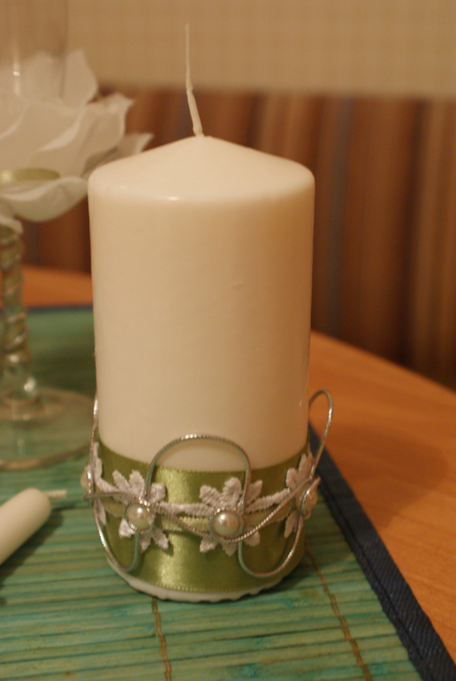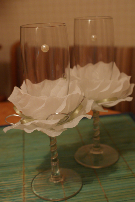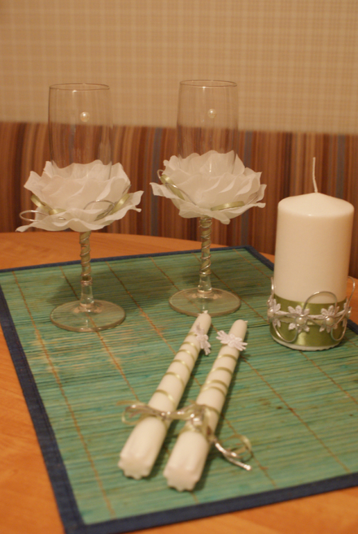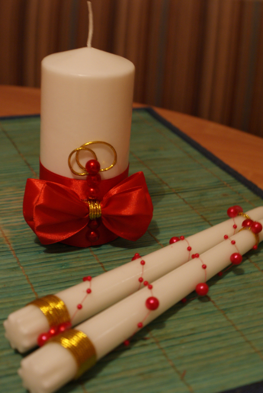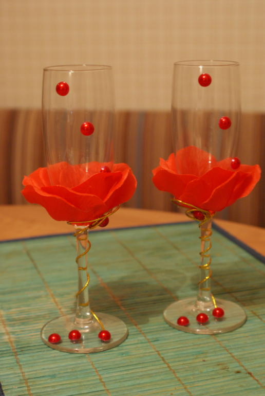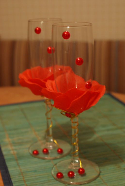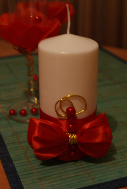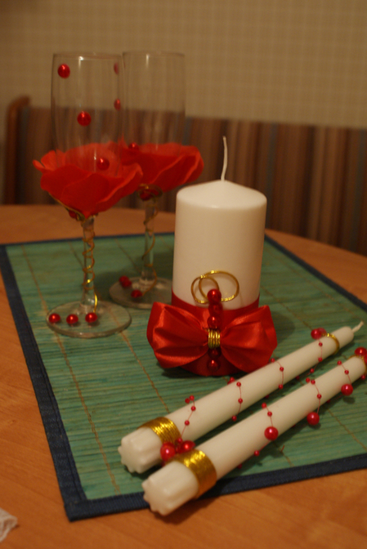 как красиво!!! я бы чуть изменила: на красных бокалах снизу бы мелких полубусин налепила россыпью(если есть), а на белых сверху вместо больших полубусин маваленькими стразами выложила сердечки... а на свечках длинных убрала бы цветочки...
