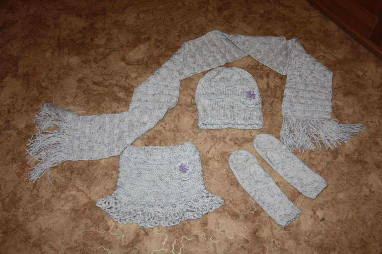 Взяла тему шарфа, который был связан уже давненько и ношен-переношен вполне успешно: 4 лицевых ряда, 4 изнаночных по лицевой стороне. Обвязала немного на глаз крючком, усложнила, а то слишком просто получилось. Поверху резинка 2х2.