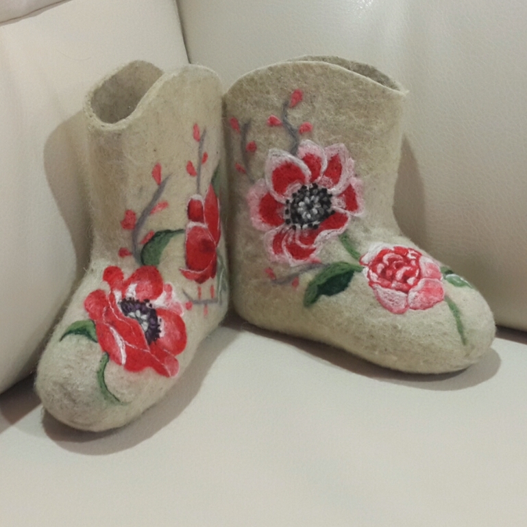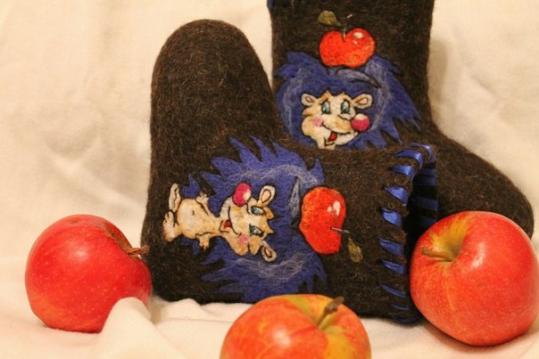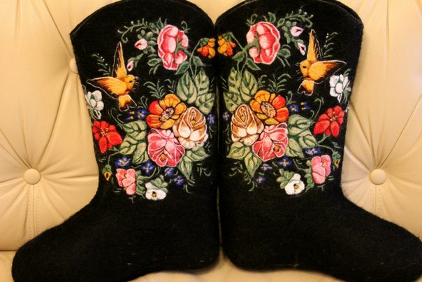 Я сама валенки валяю, но делаю рисунки шерстью. И все хочу попробовать расписать, но руки никак не доходят, заказов много! А глядя на Ваши — прямо разбирает и руки чешутся, займусь точно!