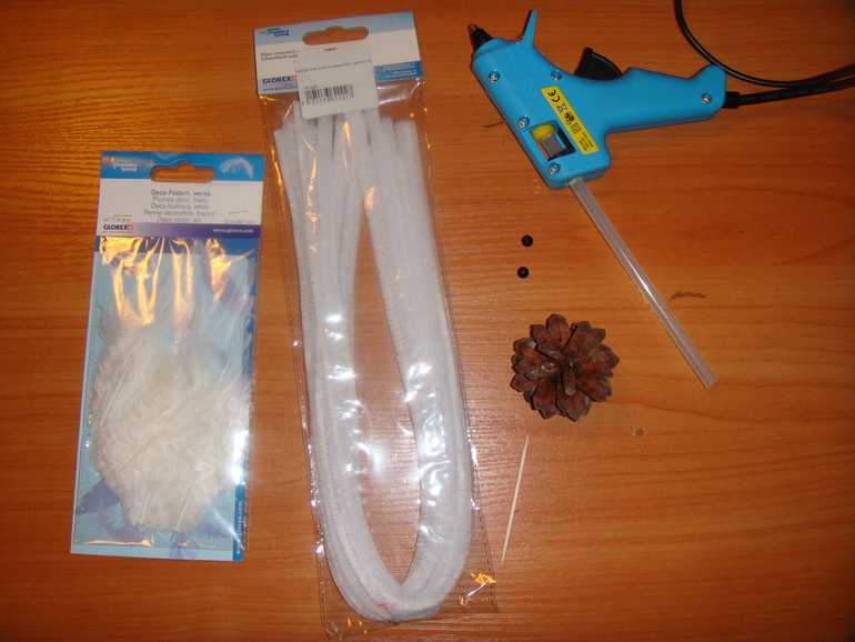 Для изготовления нам понадобится шишка, 2 бусины, зубочистка, перышки, маркер, клеевой пистолет, синель-проволока: