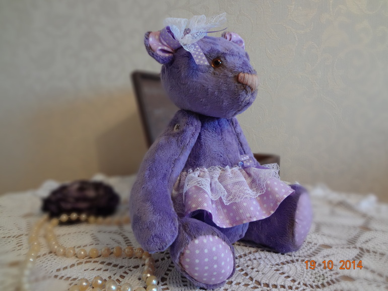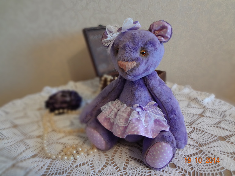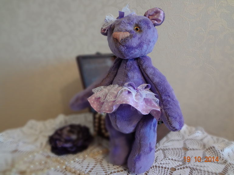 Игрушечный мир - животныеНа этот раз сшила девочку. Мишка сшита из мягкого плюша и хб.ткани. Рост 30см. Голова на шплинтовом креплении,ручки и ножки на пуговичном.Глазки стеклянные. Юбочка-пачка сшита их хлопка,фатина и кружева. На голове у мишки милый бантик.