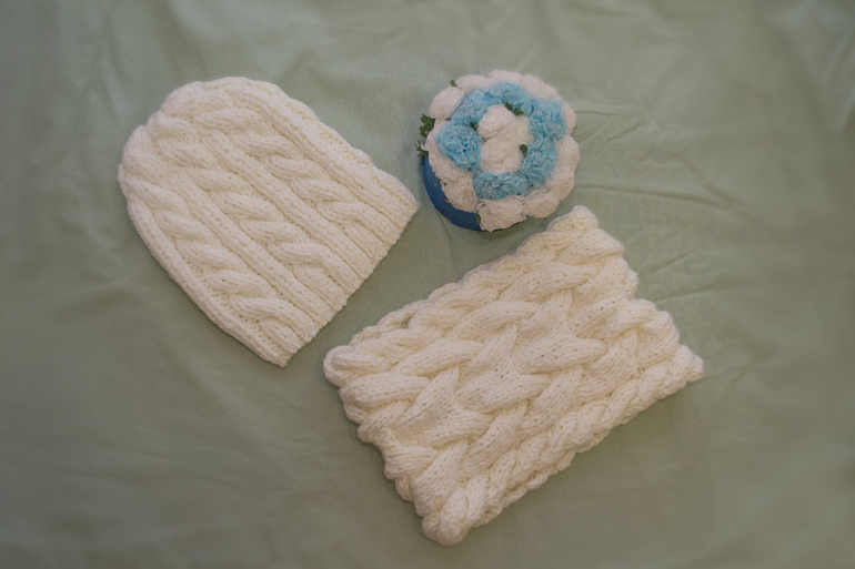 Связался вот такой комплектик из 100% итальянской мериносовой шерсти в 3 ниточки. Очень теплый и толстенький.
