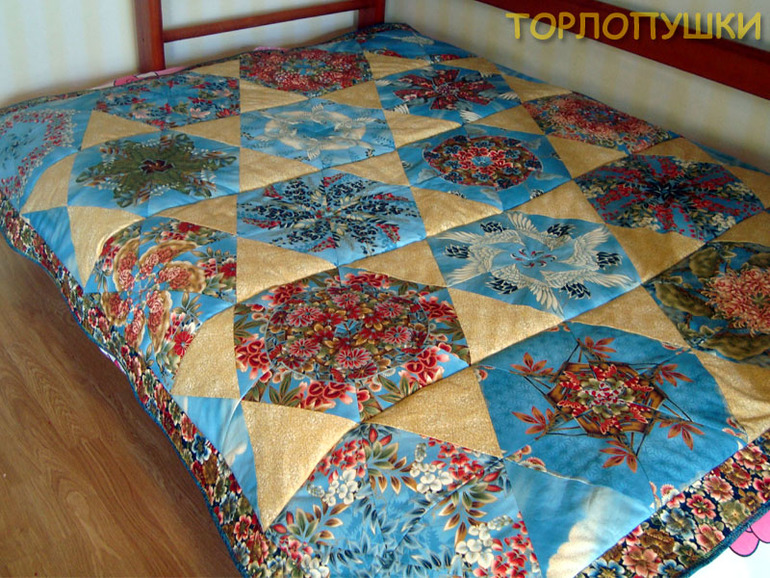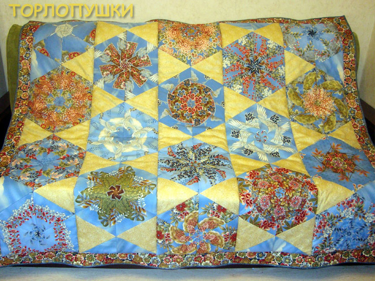 Второе одеяло, с пылу с жару, только что сшито. Это мой первый калейдоскоп. Вообще то, калейдоскоп был у меня в планах, но я не думала, что скоро доберусь до него. Очень необычная, увлекательная, одновременно сложная и простая техника.