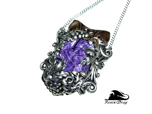 Кулон "Сиреневая сказка" с натуральным (сиреневым, фиолетовым камнем ) чароитом, стимпанк - элементами и гроздьями винограда
