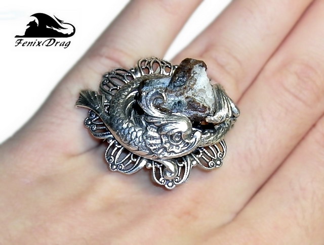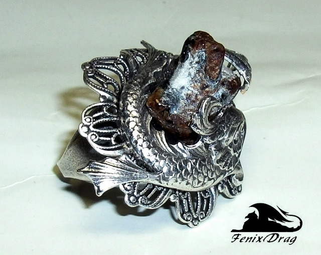 Кольцо / перстень "Камень крест" со ставролитом обвитым рыбкой на цветке