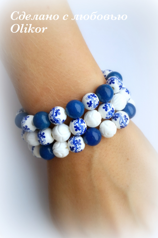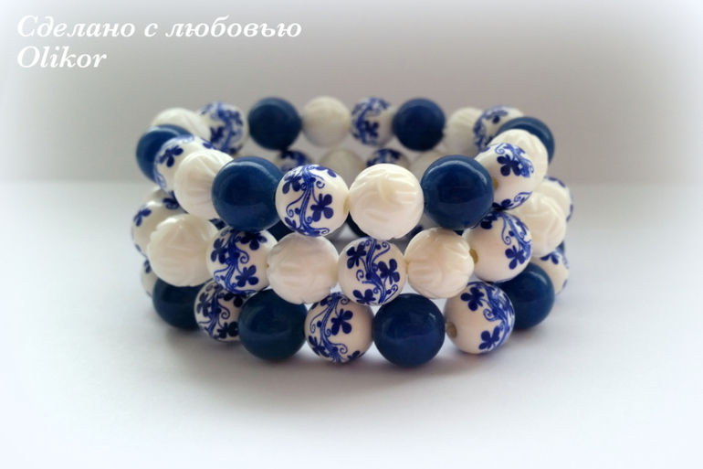 Белый резной агат, синий тонированный агат и керамические бусины.