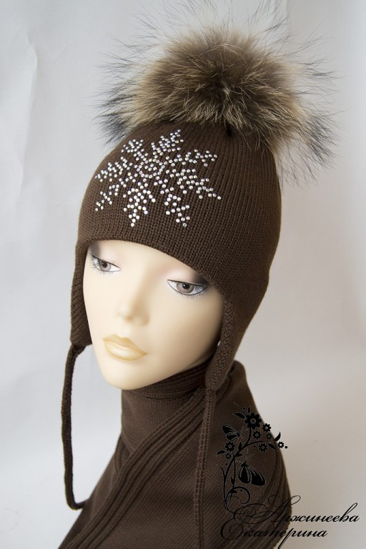 Зимний мериносовый комплект для девочки со снежинкой, жалко что фото не передает всего блеска страз, зимой на солнышке такая шапочка будет сверкать и очень ярко смотреться)))
