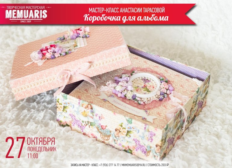 Все материалы для создания вашей работы будут предложены магазином Мемуарис и могут отличаться от представленных на фотографии, тем не менее, вас ждет самый роскошный набор для создания коробочки.