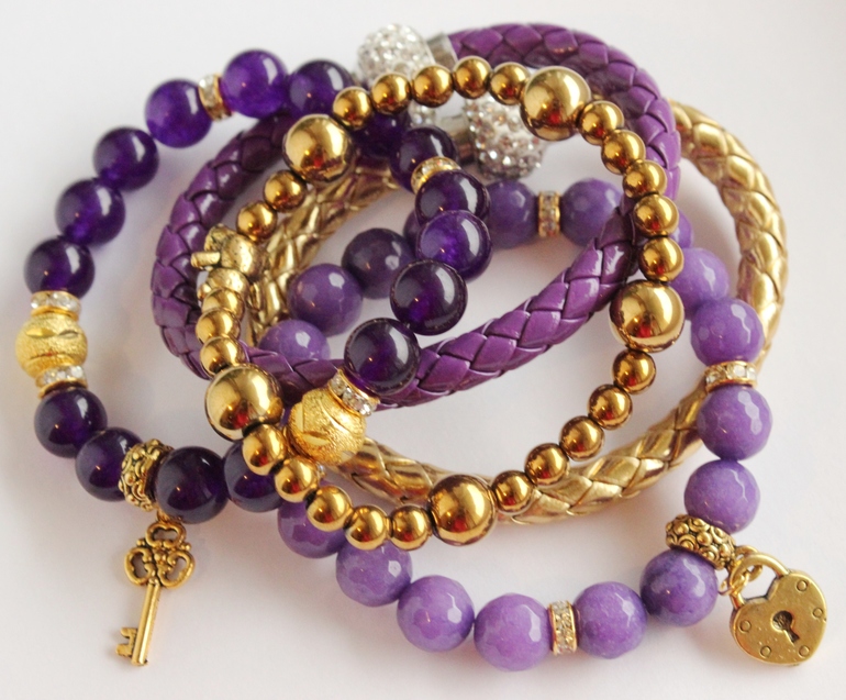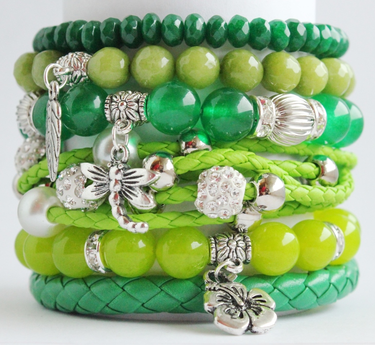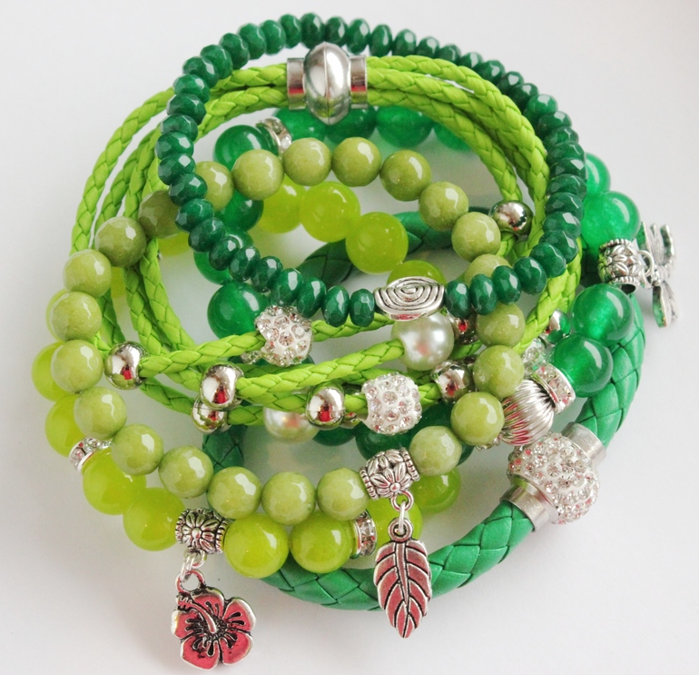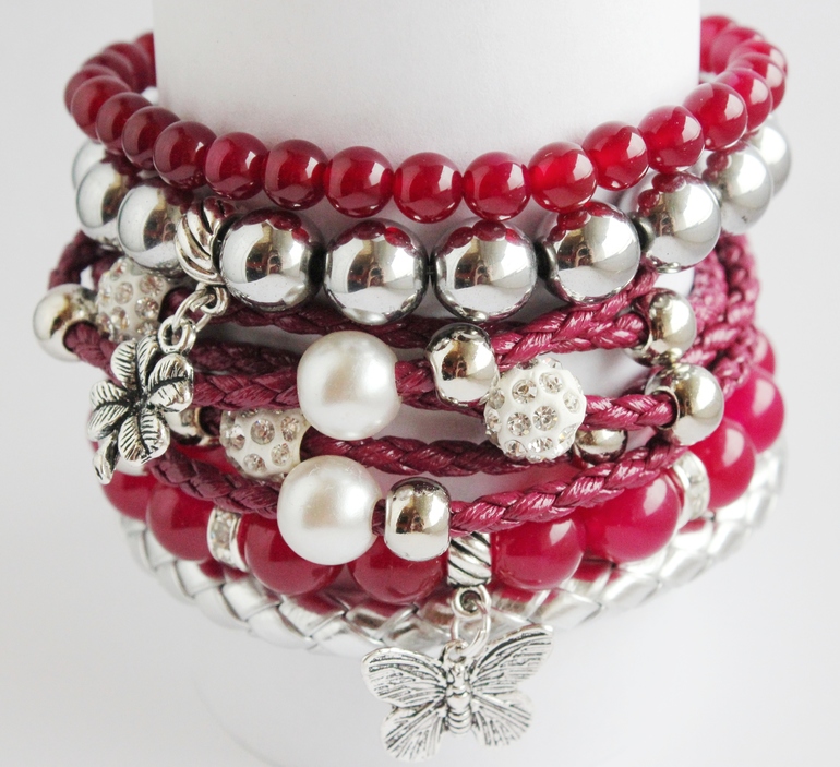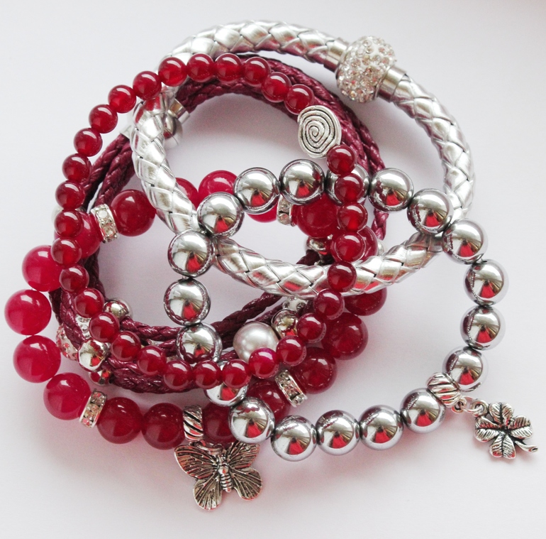 3) Комплект браслетов состоит из двух кожаных браслетов и четырёх браслетов из натуральных камней. Использовались такие материалы как:агат, рондели со стразами и фурнитура под серебро.
