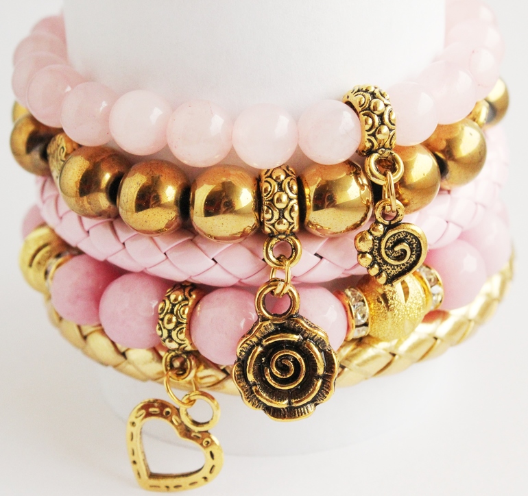 5) Комплект браслетов состоит из двух кожаных браслетов и трёх браслетов из натуральных камней. Использовались такие материалы как, агат, гематит, рондели со стразами и фурнитура под золото.