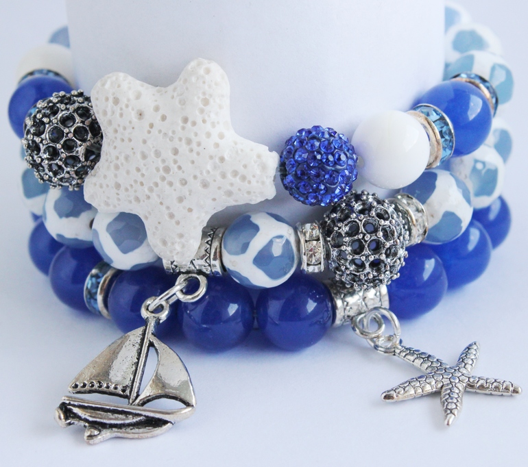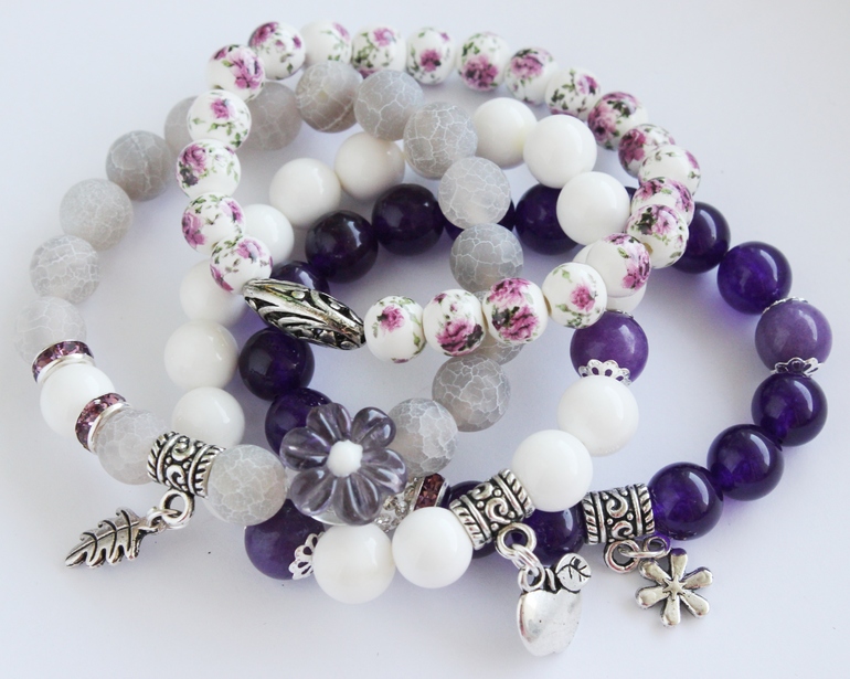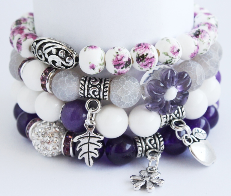 7) Комплект состоит из четырёх браслетов из натуральных камней. Использовались такие материалы как, агат, африканский агат, керамические бусины, бусина со стразами, бусина лэмпворк, рондели со стразами и фурнитура по серебро.