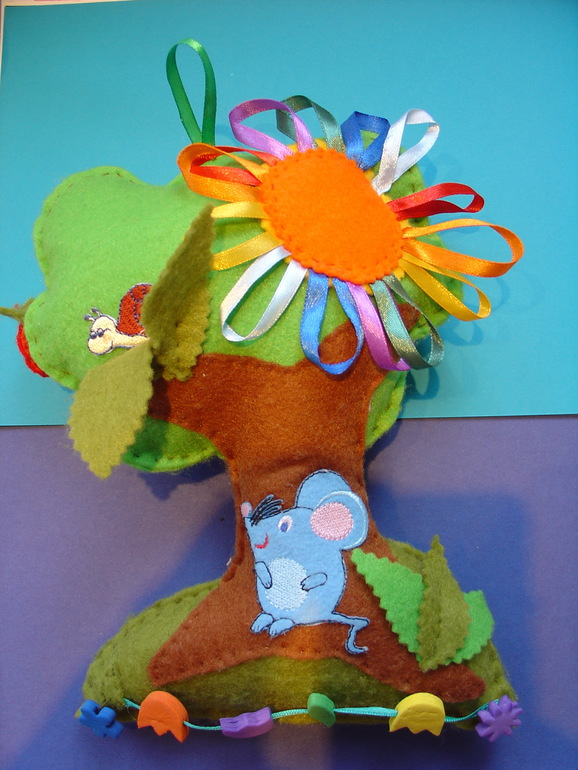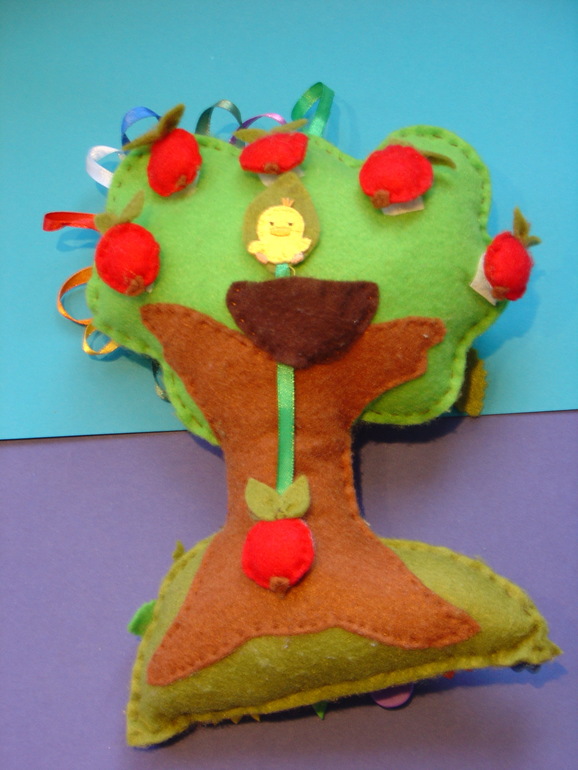 Яблоки на липучке, солнышко с лучами семи цветов радуги. Ствол и крона шуршат. Листик отгибается, там улитка. Цветочки на веревочке можно передвигать ( и грызть :) Птенец в гнезде прячется если потянуть за яблоко.