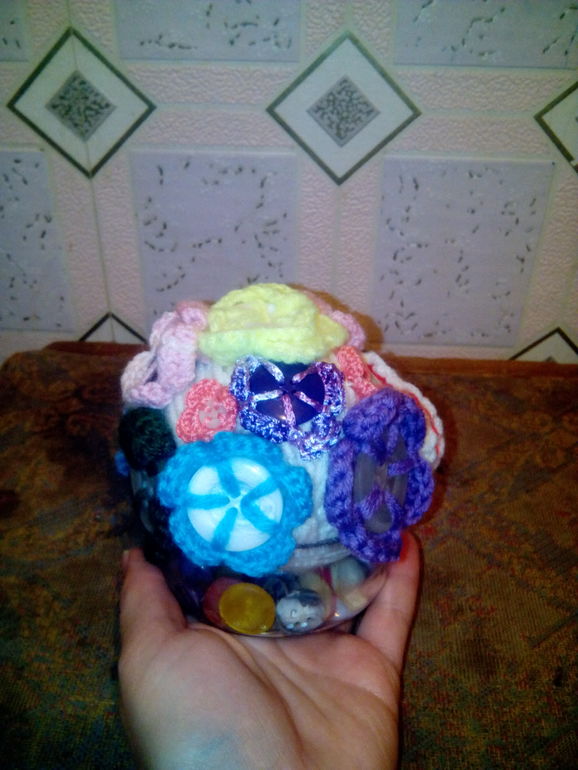 Делала из того что было. Изначально планировала из этих цветочков букет сделать зотела их на проволку. Но в доме не нашлось проволки! Пришлось пришить к клубочку и воткнуть в банку из под йогурта. Знаю что не идеально но зато сама)))