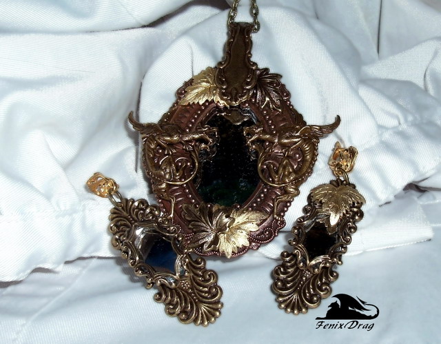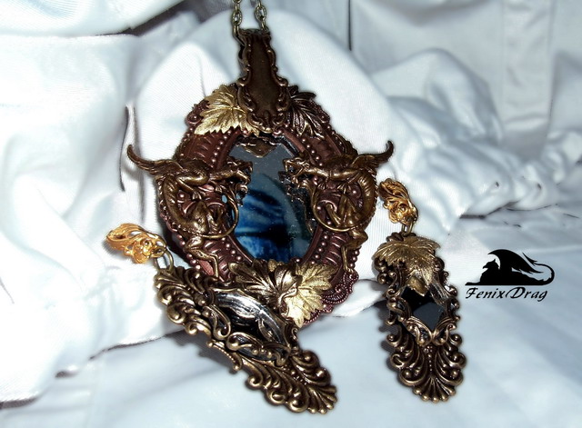 Кулон и длинные серьги "Отражение" с зеркалом, драконами и осенними листьями